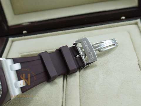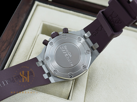 不鏽鋼材質錶殼、摺疊扣、橡膠包覆旋入式錶冠 / 皇家橡樹獨特八角形螺絲外露設計錶框 / 錶框原廠鑲嵌32顆頂級天然美鑽,共1.37CT / 夜光指針、時標 / 紫紅色全新橡膠錶帶 / 藍寶石水晶玻璃 |