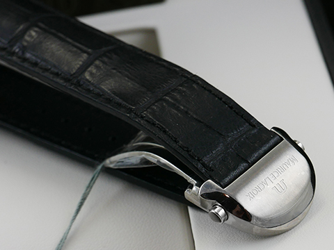 材質: 不鏽鋼錶殼及按動式摺疊帶扣 / 原廠黑色皮錶帶 / 藍寶石水晶玻璃鏡面