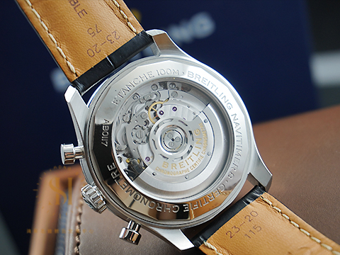 天文台認證百年靈自製01自動上鍊機芯 / 時、分、秒時間指示 / 日期窗顯示 / 60秒、30分鐘、12小時計時碼表 / 動力儲存約70小時/ 30米防水 |