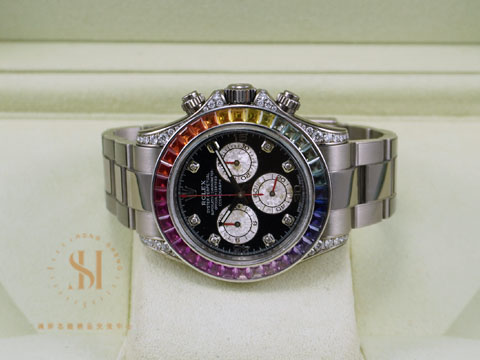無論是黃金還是白金款,近幾年越來越搶手的勞力士彩虹圈,可說是最高調的名人錶之一,好萊塢大明星Mark Wahlberg、Elton John或是華人明星名媛劉嘉玲、關穎都難以抵擋勞力士的七彩魅力! 高調的極致,就是對這只Daytona彩虹全白K金版本最貼切的形容,但這只Daytona讓人驚嘆的不只是華麗外表,錶圈上的漸層寶石除了是特色細節也是品牌工藝的強度展現!延續著彩虹Daytona的經典元素,新作錶圈上同樣以36顆梯形彩色藍寶石作紅橙黃綠藍靛紫多色的層次變化,另外由錶冠護肩延伸至錶耳也鑲嵌上56顆圓形鑽石,由於要找到36顆色彩可以完美漸變的寶石是相當有難度,因此可想見這款Daytona彩虹圈,製作難度頗高,產量自然不多,因此可想見這白K金Daytona彩虹圈絕對依然搶手。 Oyster Perpetual Cosmograph Daytona在錶殼與鍊帶材質採用勞力士專用白K金,將錶戴上手更襯女性氣質,男性上手也更斯文。此外,白K金版Daytona彩虹圈在於錶盤上的時標由8個鑽飾時標點綴,在腕錶整體視覺更一致,也是這款Daytona頗受注目的特色賣點。