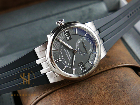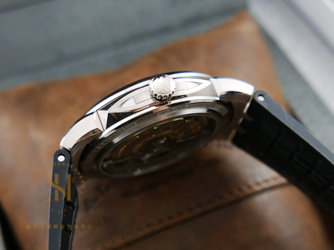 18K白金材質錶殼及原廠穿扣 / 白金指針及時標 / 原廠黑色膠帶 / 藍寶石水晶玻璃鏡面 / 透明錶背 |