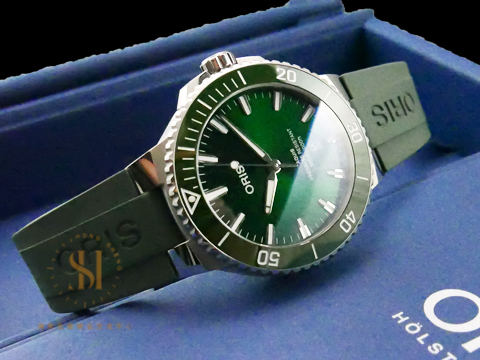 不鏽鋼材質錶殼及折疊扣、旋入式錶冠 / 夜光指針、柱狀時標 / 單向旋轉綠色陶瓷錶框 / 原廠綠色橡膠錶帶 / 藍寶石水晶玻璃 / 透明錶背 |