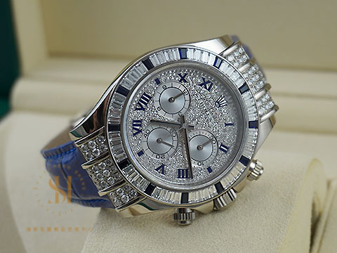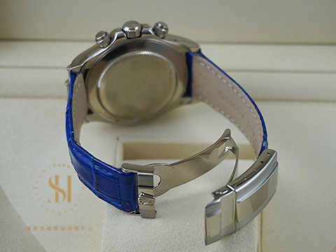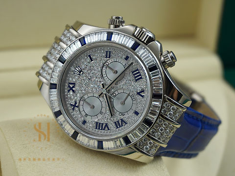 18K白金材質錶殼、摺疊扣、旋入式錶冠 / 原廠梯鑽、藍寶石外圈 / 羅馬數字時標 / 原廠滿天星鑽石面盤 / 替用藍色皮帶 / 藍寶石水晶玻璃 |