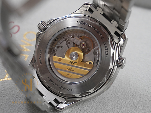 這款「龐德中校」腕錶配備不鏽鋼錶殼,拋光白色陶瓷錶盤設有藍色刻面鏤空時針和分針,紅色亮漆秒針末端飾有「007」手槍標誌。波浪圖案旋入式錶背鐫刻了「Commander’s Watch」、「Limited Edition」字樣及限量版編號。透明錶背飾以9毫米子彈的自動盤、飾以007及歐米茄標誌的裝飾底板,以及機芯編號。腕錶搭配藍色、紅色、灰色五條紋NATO錶帶;搭載歐米茄自製2507機芯。此「龐德中校」腕錶限量推出7,007枚。