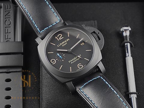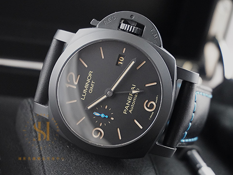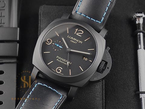 功能: 沛納海燻黑版 P.9010 自動上練機芯 / 時、分、小秒針指示 / GMT兩地時間顯示 / 能量顯示 / 3點鐘位置日期窗顯示 / 防水100米 / 72小時動力儲存