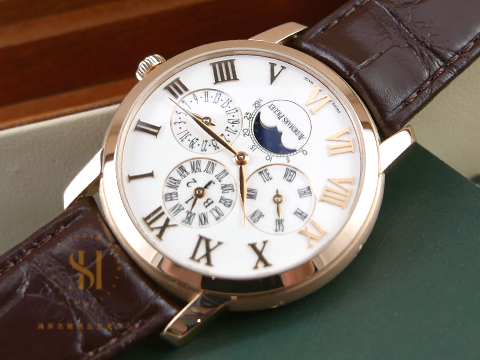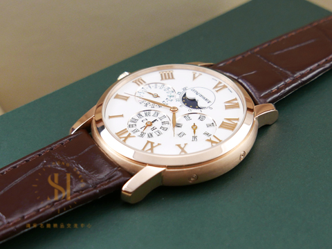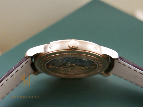 18K玫瑰金錶框、錶殼、摺疊扣、錶冠 / 18K玫瑰金立體羅馬時標 / 全新替用棕色鱷魚皮錶帶 / 藍寶石水晶玻璃鏡面及透明錶背 |
