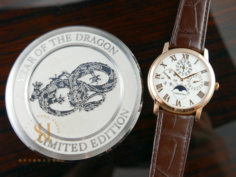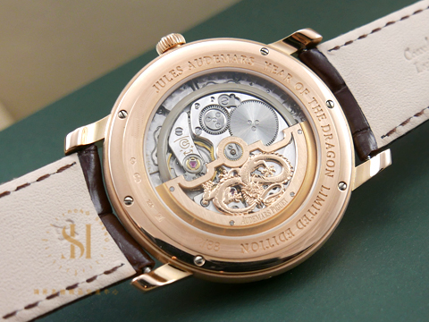 2012年,這款限量龍的超薄萬年歷腕表,以優雅18K玫瑰金表殼打造,精致的玫瑰金時標搭配簡單大方的萬年歷各指示盤於白色漆面表盤上,顯得優雅而覆古。翻轉至表背面欣賞透明藍寶石後底蓋,首先躍入眼簾的即是在18K金自動盤上精雕細琢的龍圖案,盤踞如8字形的五爪金龍不僅生動細致活靈活現,更低調內斂顯出尊貴氣勢。