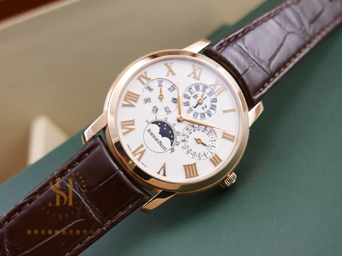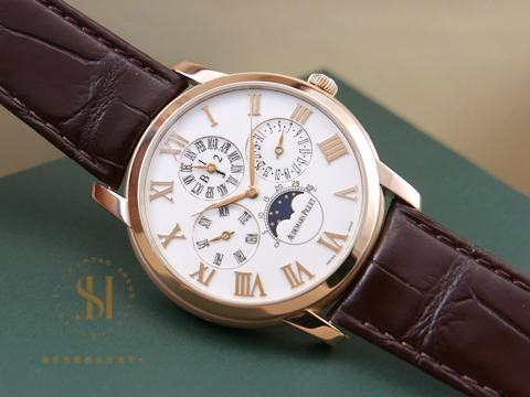 愛彼錶Cal.2120/2802自動上鏈機械機芯 / 時、分二針時間指示 / 星期、日期、月份、閏年顯示萬年曆 / 月相盈虧顯示功能 / 動能儲存40小時 / 生活防水20米 |