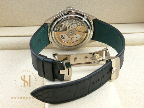 18K白金材質錶殼、摺疊扣 / 原廠黑色鱷魚皮&綠色小牛皮內襯錶帶 / 藍寶石水晶玻璃鏡面 / 透明錶背 |