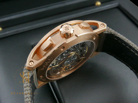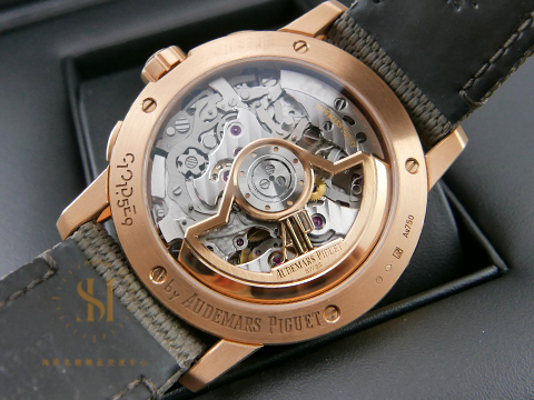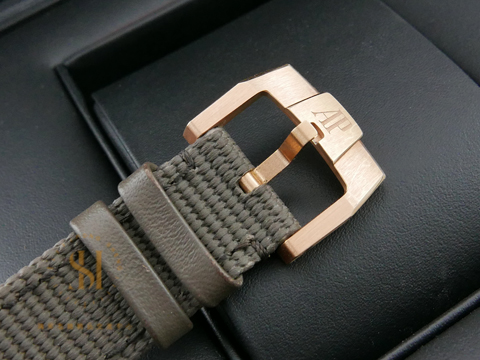 18K玫瑰金錶殼及帶扣、針式帶扣 / 18K玫瑰金立體時標與時針/ 24K玫瑰金立體鑲貼愛彼商標 / 原廠棕色織紋橡膠覆層錶帶 / 雙曲面藍寶石水晶玻璃鏡面及透明錶背 |