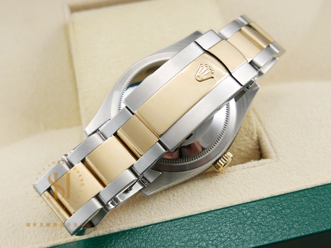 材質: 904L鋼+18ct黃金錶殼、錶帶及摺疊帶扣 / 旋入式錶冠 / 三角坑紋外圈 / 藍寶石水晶玻璃 / 防偽内圈