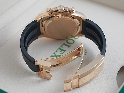 腕錶的醇黑色及香檳色錶面設有噴塗計時盤,18K金鐘點標記及指針塗上清晰易讀的Chromalight夜光物料。 車手可以通過錶面顯示,準確得知已用時間,決定如何行駛剩下的路程以最終獲勝。 配備Cerachrom外圈的Cosmograph Daytona 18K金款,均搭配Oysterflex錶帶。此創新錶帶由勞力士研發並獲得專利,將金屬錶帶的堅固可靠,以及橡膠錶帶的舒適集於一身。 錶帶內裡由兩塊弧形彈性金屬片組成,錶帶兩側各一片,外層則以高性能黑色橡膠注塑包覆。為確保佩戴更舒適,Oysterflex錶帶內側配備緩衝系統,蠔式保險扣則防止錶帶意外開啟。通過Rolex Glidelock延展系統即可調節錶帶長度。