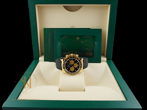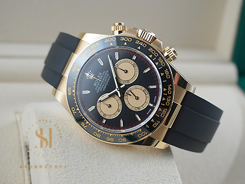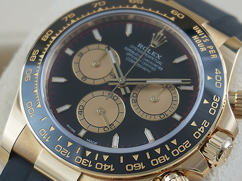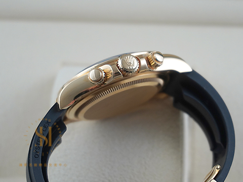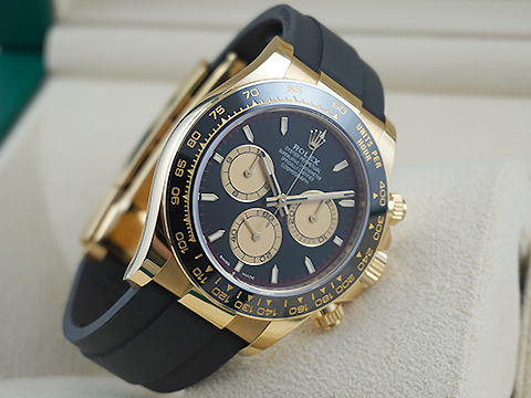 材質: 18K黃錶殼、摺疊扣、旋入式錶冠、一體成型黑色Cerachrom陶質字圈連鑄模測速計 / 夜光指針、立體夜光時標 / 原廠黑色Oysterflex橡膠錶帶 / 藍寶石水晶玻璃