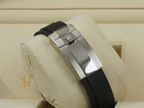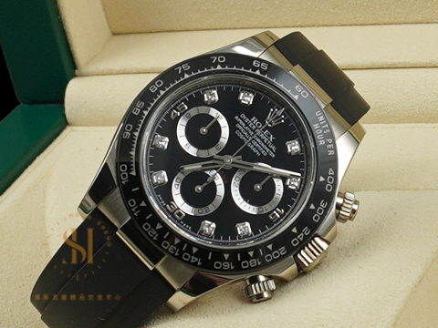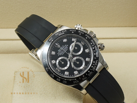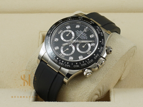 材質: 白K金材質錶殼、摺疊扣、旋入式錶冠及計時按把 / 黑色陶瓷視距儀刻度錶框 / 原廠鑲嵌鑽石時標 / 原廠黑色Oysterflex橡膠錶帶 / 藍寶石水晶玻璃鏡面 / 防偽內圈