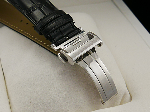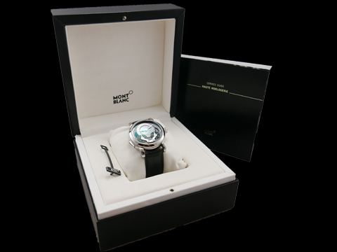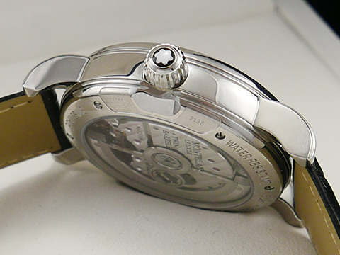 不鏽鋼材質錶殼、摺疊扣、白朗峰標幟錶冠 / 藍鋼夜光指針、阿拉伯數字時標 / 全新黑色鱷魚皮錶帶 / 藍寶石水晶玻璃 / 透明錶背 |