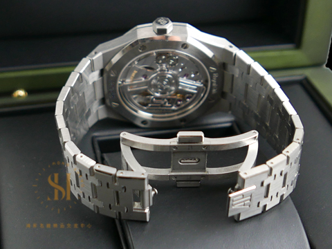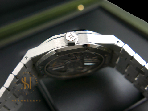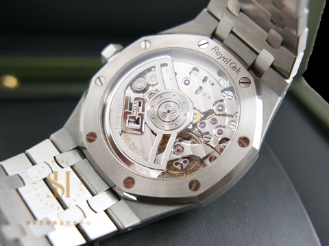 不鏽鋼材質錶殼、錶帶、摺疊扣、旋入式錶冠及皇家橡樹獨特八角形螺絲外露設計錶框 / 夜光指針、立體柱狀時標 / 藍寶石水晶玻璃 / 透明錶背 |