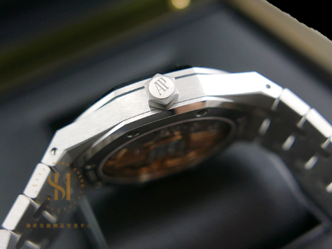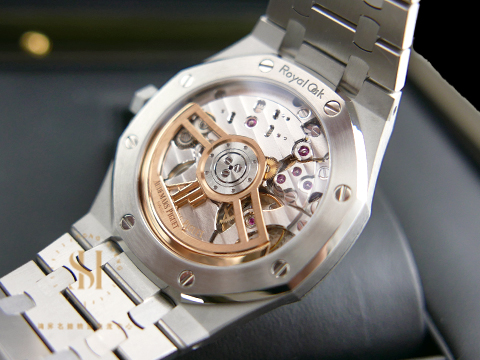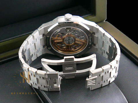 不鏽鋼材質錶殼、錶帶、摺疊扣、旋入式錶冠及皇家橡樹獨特八角形螺絲外露設計錶框 / 夜光指針、立體柱狀時標 / 藍寶石水晶玻璃 / 透明錶背 |